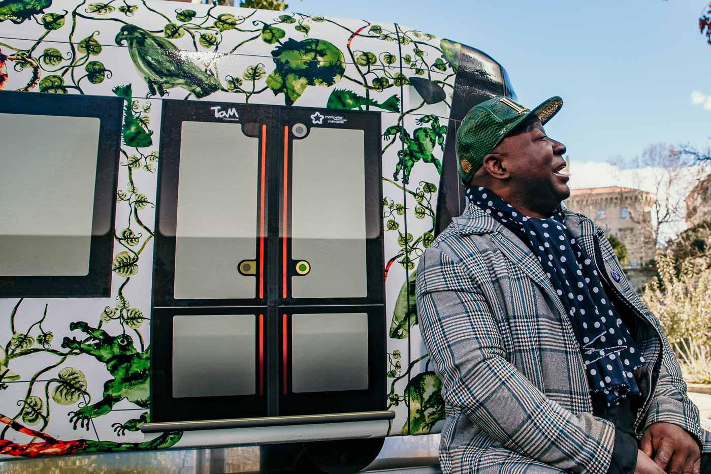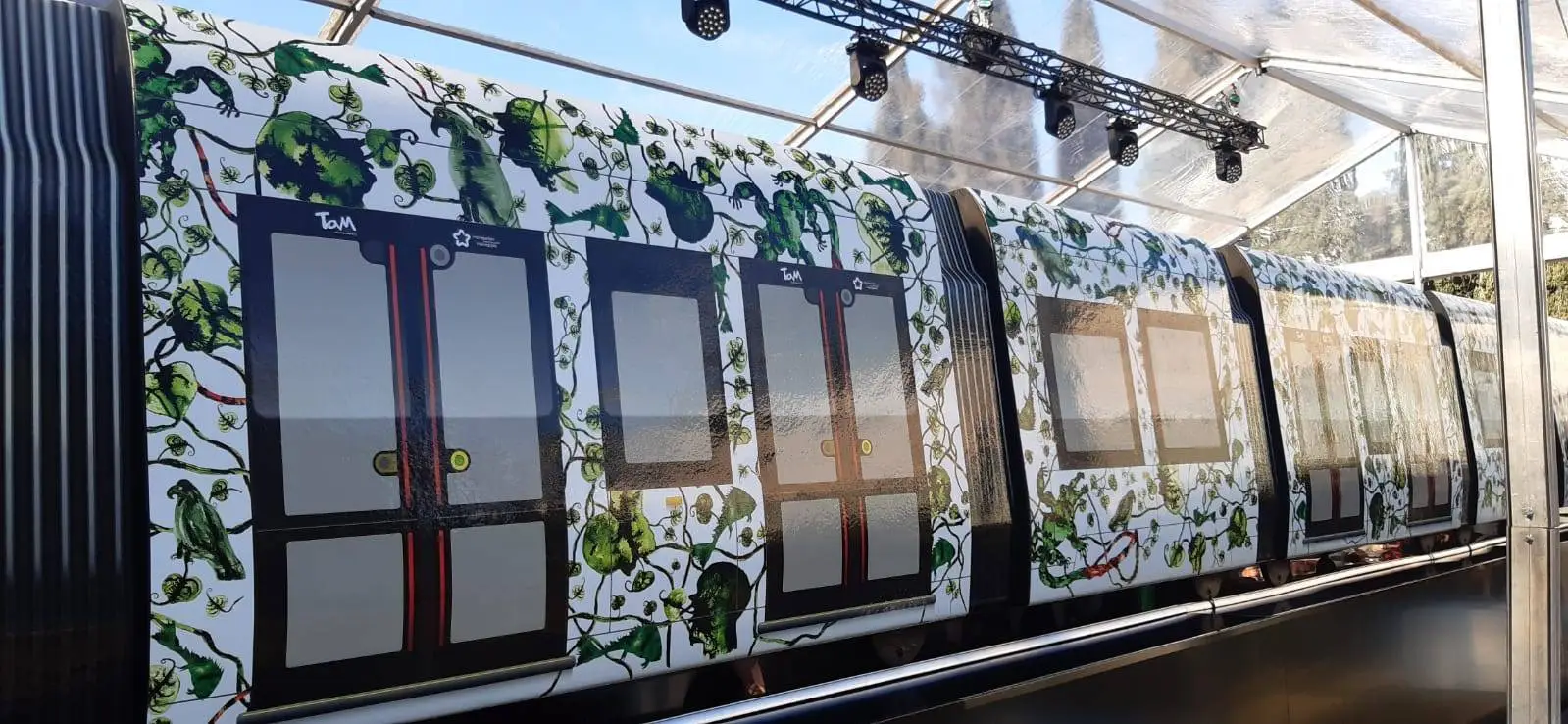 L'artiste Barthélémy Toguo, qui a réalisé le design de la ligne 5 s'est inspiré de la nature et des vignes, très présentes sur notre terroir, pour réaliser le design des nouvelles rames de tramway.