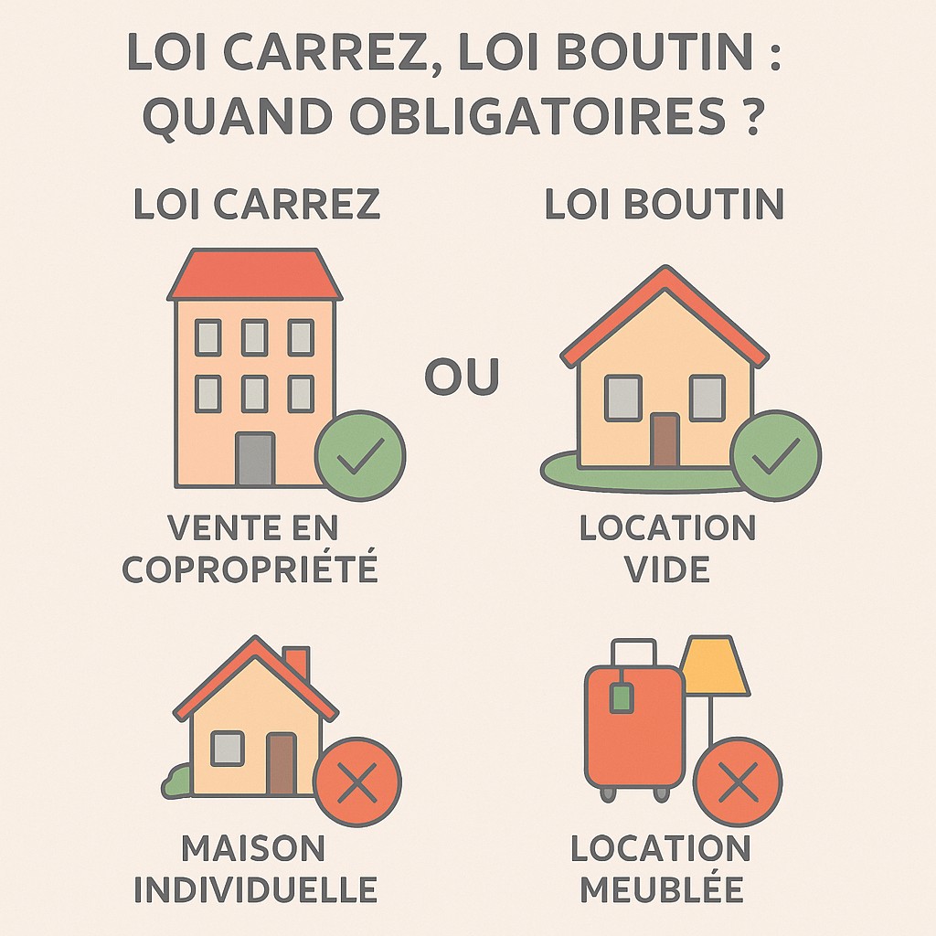 - Loi Carrez : obligatoire pour la vente d’un bien en copropriété (surface privative).